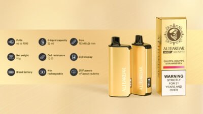 The Alibarbar Ingot 9000-Puff E-cigarette features a large 22ml e-liquid capacity and a long-lasting 2350mAh battery. It boasts a visible LED display and a sleek gold body, delivering a modern and technologically advanced smoking experience.