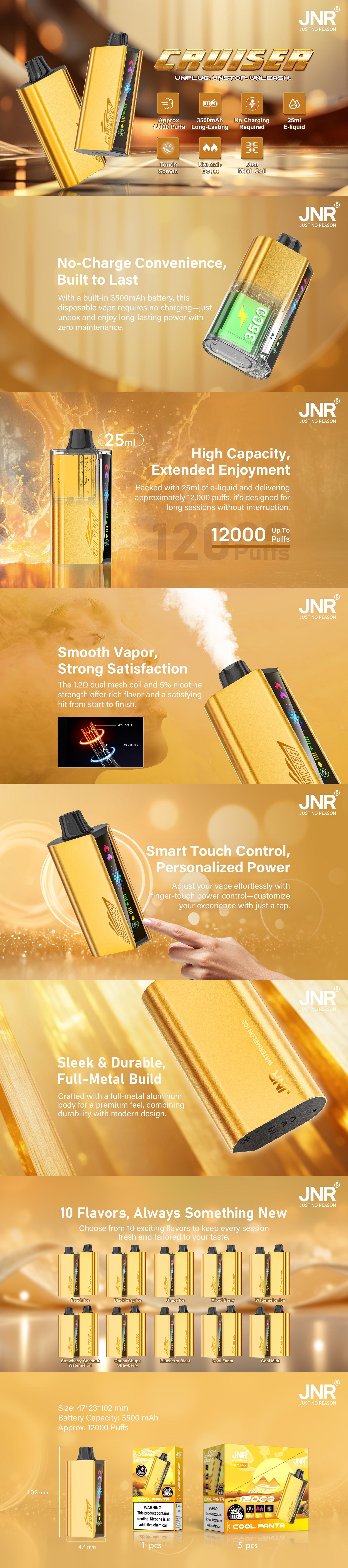 Featuring a sleek full-metal aluminum bofy,an intuitive smart touch screen control,and a powerful 12,000-puff capacity with 25ml of e-liquid,JNR redefines what modern vaping should feel like.With dual puff modes and a wide range of flavors,we offer the perfect combination of personalization and performance.This is more than just a vape- it’s the mark of a global brand built on innovation,quality,and style.